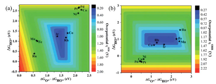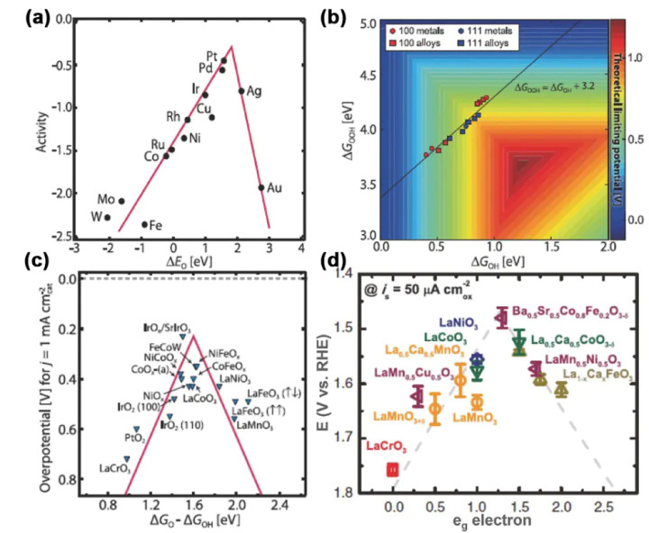 Zhou等人的研究中,OER火山图以OH吸附自由能变为横轴,过电位为纵轴,颜色梯度表示η增大,顶点对应CoPc等高效催化剂,证实了ΔGHO作为描述符的有效性;Čolić的ORR火山图以O吸附能为横轴,交换电流密度log j₀为纵轴,Pt位于顶点,活性显著优于Ir、Pd等金属,明确了Pt在ORR中的优势源于对O的适中吸附强度。