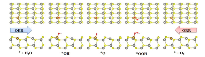 反应机制的差异是二者性能不对称的核心原因:OER主要遵循吸附演化机制,通过四步质子–电子转移过程进行,关键中间体为OH、O、OOH;ORR除AEM外,还存在晶格氧机制和双位点机制,其中OOH的吸附自由能多是决定反应路径选择性的关键参数。