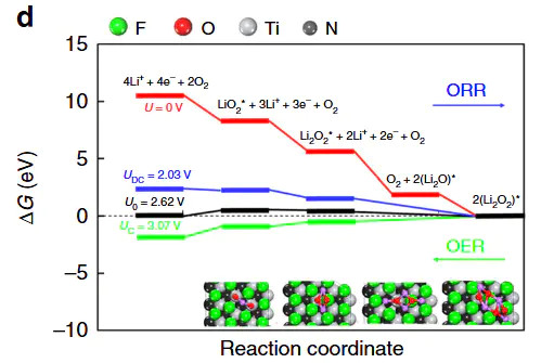 吉布斯自由能图通过可视化各步能量变化识别决速步,Ostadhossein等人的研究中,横轴为OER反应路径,纵轴为ΔG,结果显示F修饰TiₓNᵧTₓ MXene的决速步势垒显著低于未修饰表面,揭示了F修饰通过电子效应优化OOH吸附的机制。