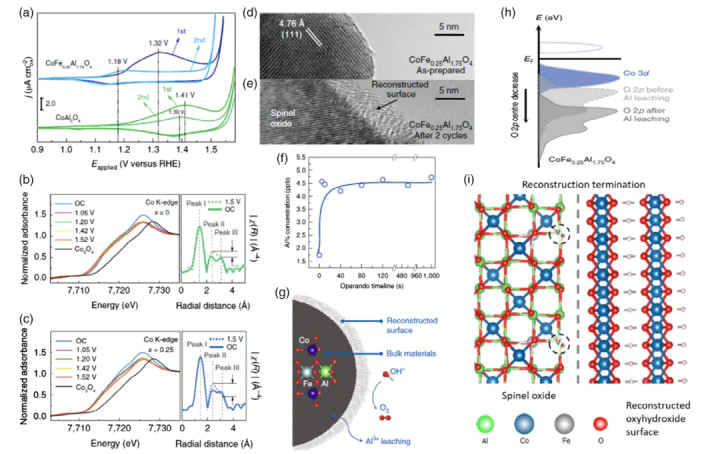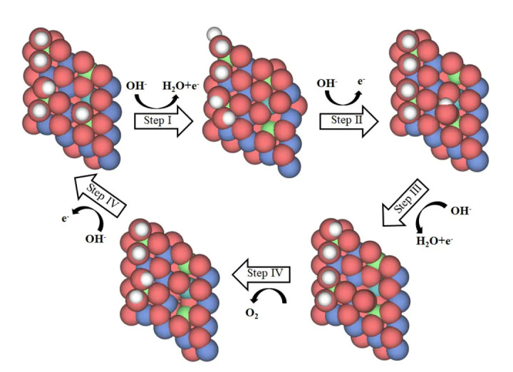 在AEM路径中,*O→*OOH步骤的自由能变为1.58 eV,成为决速步;而在LOM路径中,晶格氧参与反应,*O_lattic→*O₂步骤的ΔG为0.87 eV,能垒显著降低。