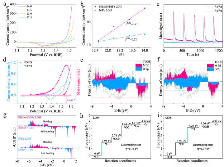 机制互证方面,如NiMoN/NiFe LDH的OER研究中,¹⁸O同位素标记实验发现晶格氧参与反应,DFT计算则证实晶格氧机制(LOM)的能垒低于传统吸附质机制,二者共同证实LOM为主要路径。