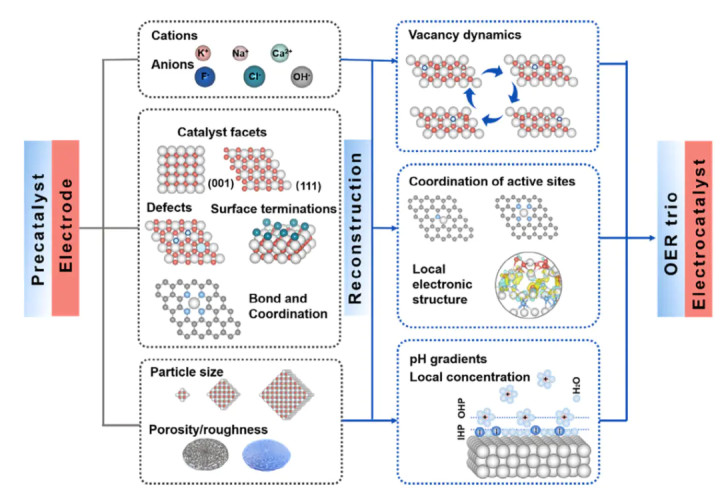 针对高离子强度电解液,DFT结合泊松–玻尔兹曼方程(PBE)处理离子分布,如Li⁺在NiFe LDH表面的吸附使OOH的ΔG降低0.2 eV,解释了Li⁺添加剂的活性提升作用。