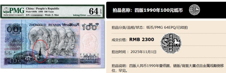 这样一张汇集了多种“错误”的纸币,注定会有不错的溢价,在11月1日的时候,它以2300元的价格被拍出。