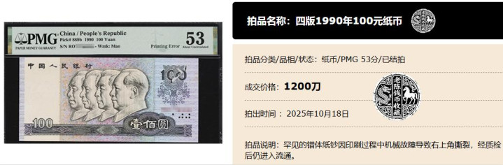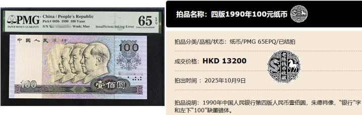 您讲,这得有多巧才会弄成这模样,就是在10月9号,这么一张缺墨的错版纸币,拍出了13200港币,相当于12000元呢!
