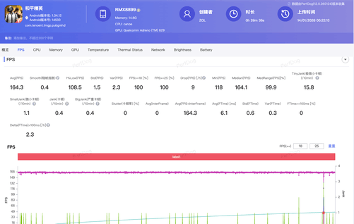 真我Neo8也并没有浪费这块165Hz的好屏幕,支持《和平精英》165Hz模式,一局30分钟的排位下来,平均帧率达到了164.3帧,开云app官方稳帧指数仅有0.4。