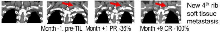 研究表明,TIL疗法与免疫检查点抑制剂的联合使用具有协同作用。这种“双剑合璧”的策略已在临床上显示出惊人效果。1期试验(NCT03215810)显示,13例患者中3例确认缓解,11例肿瘤负荷减轻,2 例患者在1.5年后持续获得完全缓解。其中一名肺腺癌患者,在接受纳武利尤单抗治疗时便产生部分缓解(PR),于是继续接受纳武利尤单抗治疗。但是10个月后病情进展,出现转移性淋巴结肿大,活检证实了新的肋骨软组织转移,随后接受了TIL治疗。幸运的是,TIL细胞回输后实现了完全缓解(CR)。