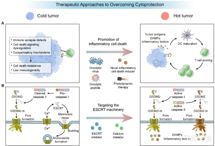 图5 克服“细胞保护”的治疗策略。通过诱导炎症性细胞死亡和靶向ESCRT膜修复机制,可以有效破解癌细胞的防御,并释放免疫刺激信号。