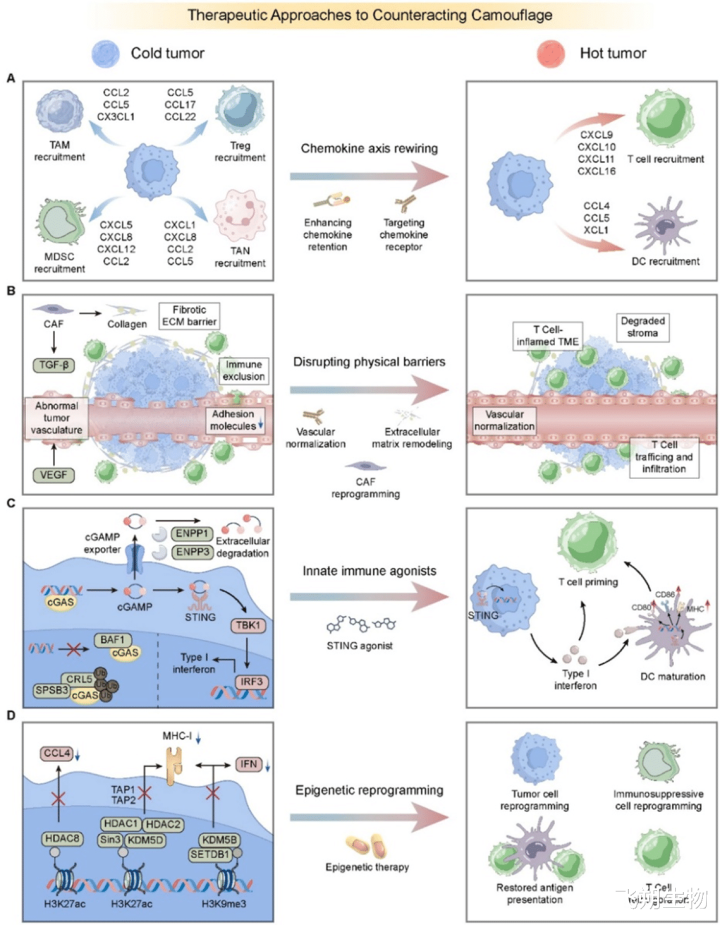 图3 对抗“伪装”的四大治疗策略,旨在通过重塑趋化因子轴、破坏物理屏障、激活先天免疫和表观遗传重编程,将冷肿瘤转变为热肿瘤。