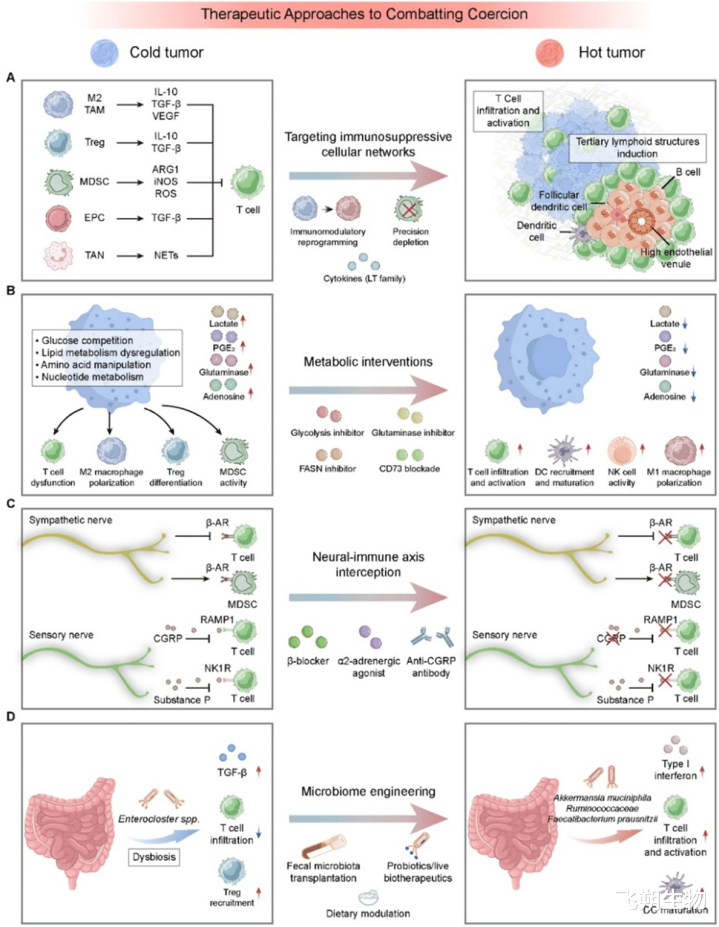 图4 对抗“胁迫”的治疗策略,包括靶向免疫抑制细胞网络、代谢干预、神经-免疫轴阻断和微生物组工程,共同瓦解肿瘤的免疫抑制环境。
