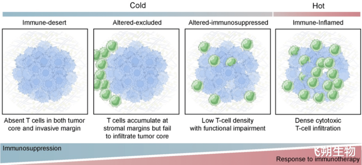图1 肿瘤的免疫表型。从左至右展示了从“冷”到“热”的演变:免疫沙漠型(几乎无T细胞)、免疫排斥型(T细胞被阻挡在外)、免疫抑制型(T细胞功能受损),最终到免疫炎症型(即“热肿瘤”,T细胞大量浸润)。