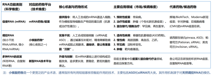 图表6 RNA种类、药物平台与应用领域对应关系