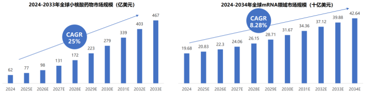 RNA药物市场增长迅猛:全球小核酸药物与mRNA疗法市场预计持续高速增长,至2033年分别有望为467亿美元(CAGR 25%)与426.4亿美元(CAGR 8.28%)。RNA药物已从传染病疫苗拓展至肿瘤、罕见病、慢性病等多个治疗领域。