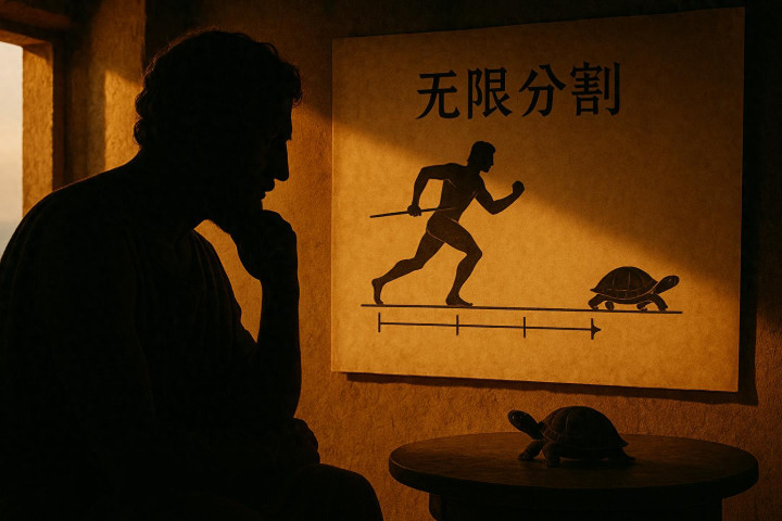 庄子说"一尺之捶,日取其半,万世不竭",意思是理论上可以永远分割下去。古希腊哲学家芝诺更狠,他提出了著名的"阿喀琉斯追乌龟悖论":跑得最快的英雄永远追不上乌龟,因为他要先到乌龟的起点,但这段时间乌龟又爬了一点,如此无限循环。