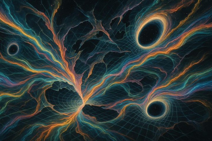 有个大胆理论叫"全息原理":想象一个薯片桶,我们感觉自己是桶里立体的薯片,但关于薯片的所有信息,其实都记录在桶侧面那个二维的条形码上。我们的三维宇宙,可能只是一个二维信息平面的投影。