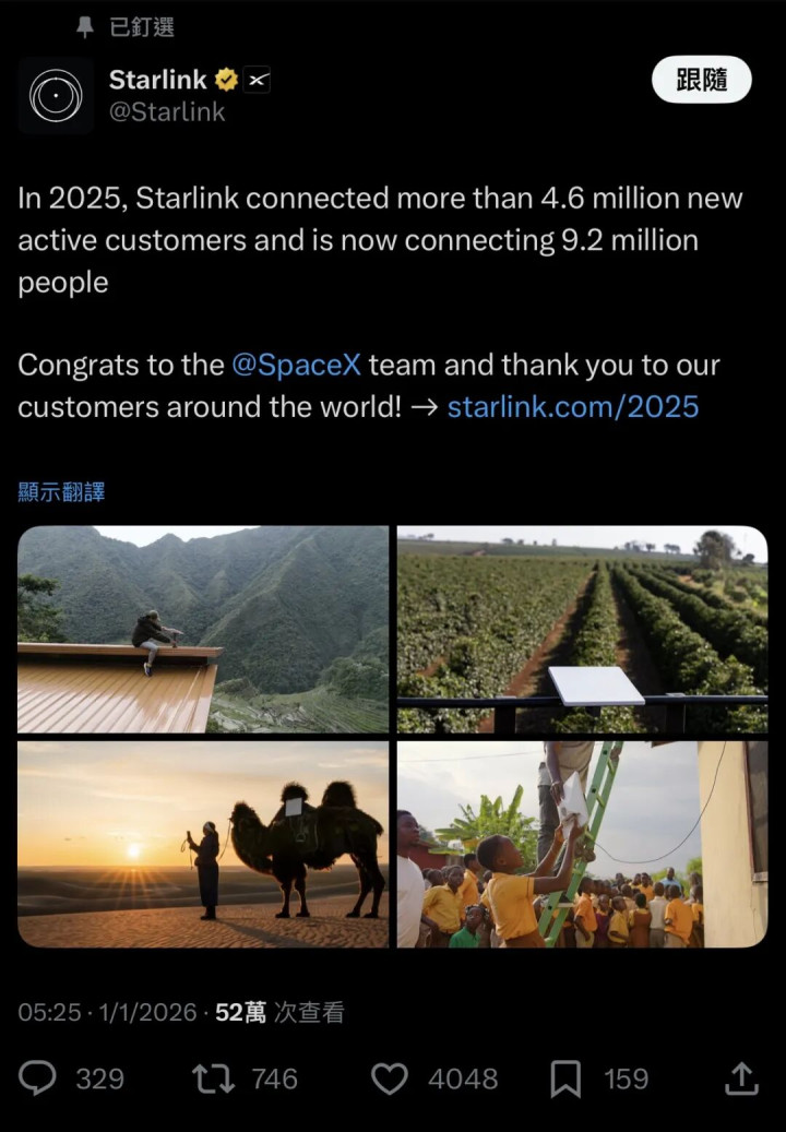 “星链”目前在轨运行的卫星数量超过9000颗,其卫星互联网服务获得了920万活跃用户,覆盖全球155个国家和地区。2025年全年,“星链”新增活跃用户数量达460万。