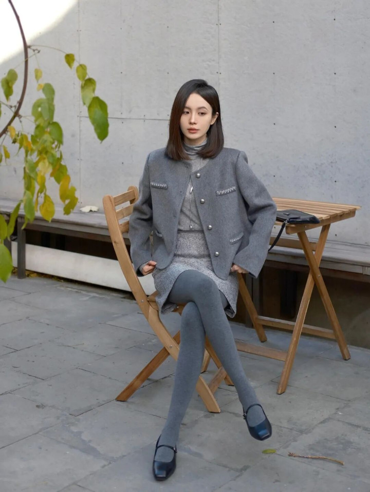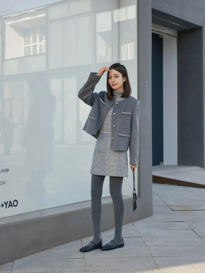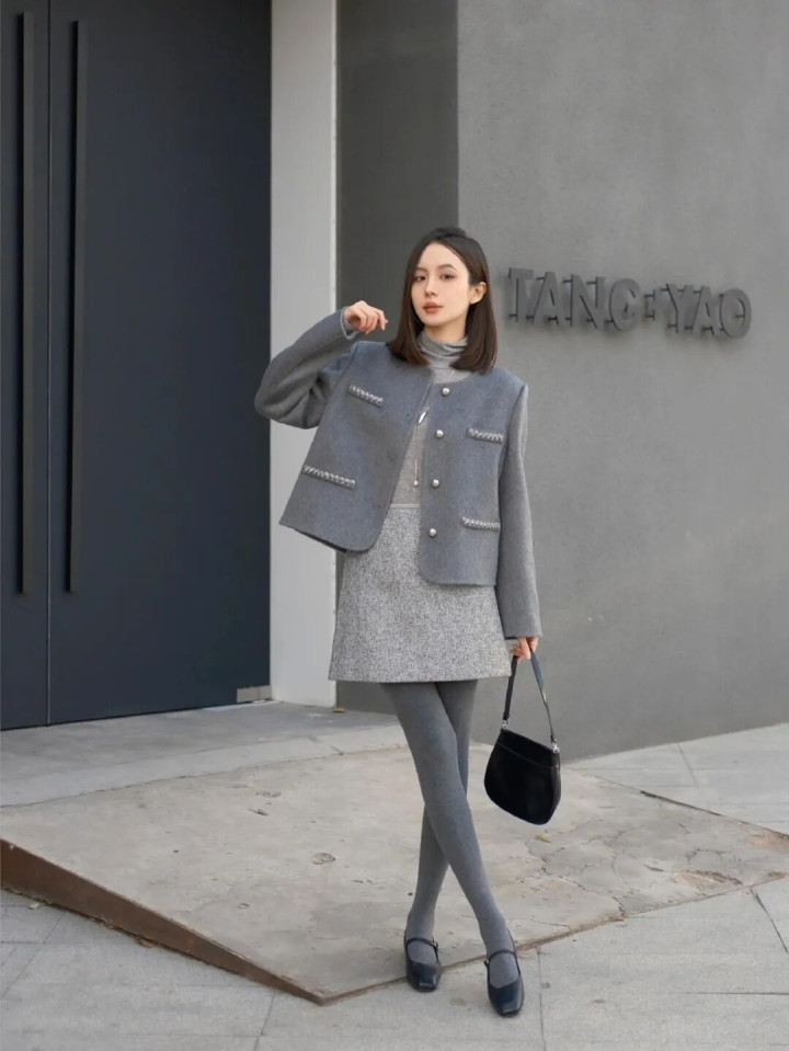 开云 “灰色小香风+半裙+厚灰”, 冬天穿一身灰色高级又耐看
