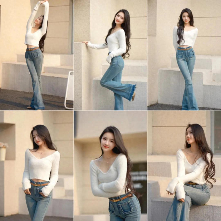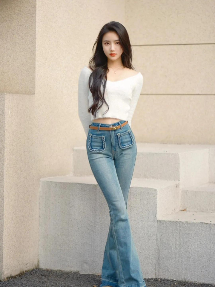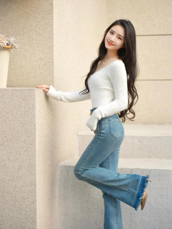 牛仔裤拍照时侧着身体站立能很好拉长比例,双手自然抱在胸前,身体微微前倾一点,再抬头微笑,这个动作会让腰线显得更高,腿部线条也更顺,画面看起来很轻松,牛仔裤的显身材效果会被放大,整体气质干净又好看。