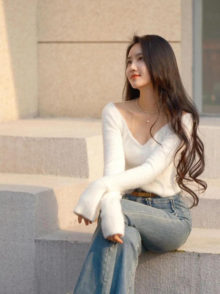 牛仔裤拍照坐下来也很加分,侧坐时把腿自然叠起来,双手轻轻交叉放好,视线看向远处微笑,牛仔裤的腿型优势会被完整保留下来,画面显得很放松,整体看起来身材好又有气质。