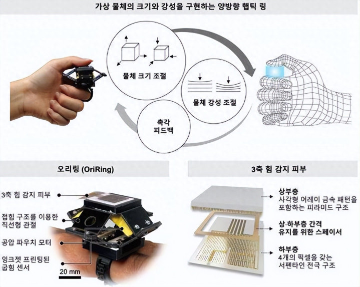所以,成均馆大学和瑞士洛桑联邦理工学院的研究团队开发了一种能够精确检测用户手部动作产生的多轴力的三轴力传感器,并将其应用于超轻量可穿戴触觉设备OriRing中。