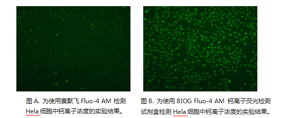 我们实验室就曾比较过市面上常用的这两种试剂盒,一个是赛默飞的单一Fluo-4, AM, cell permeant检测试剂,另一个是配置全面的BIOG Fluo-4 AM钙离子检测试剂盒,分别使用两款试剂检测同批次Hela细胞中的钙离子浓度,实验结果如下图所示,使用配置全面的试剂盒(图B)所获得的荧光信号强度与清晰度,显著优于仅使用单一Fluo-4 AM探针的实验结果(图A)。
