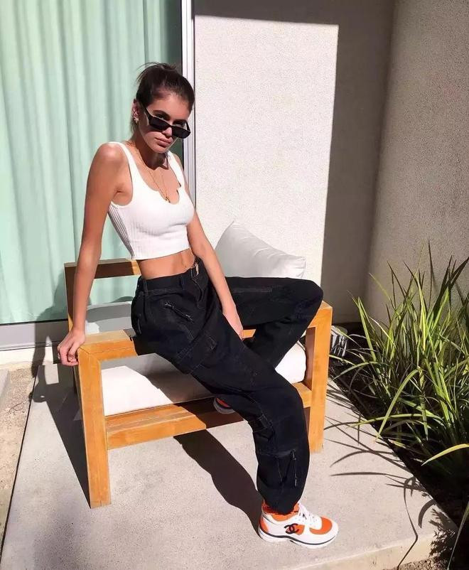 钟Sir发现肯豆穿工装裤一定会采用“上短下长”的穿法,露出小细腰,穿出大长腿,于是短款背心成为工装裤的搭配首选。