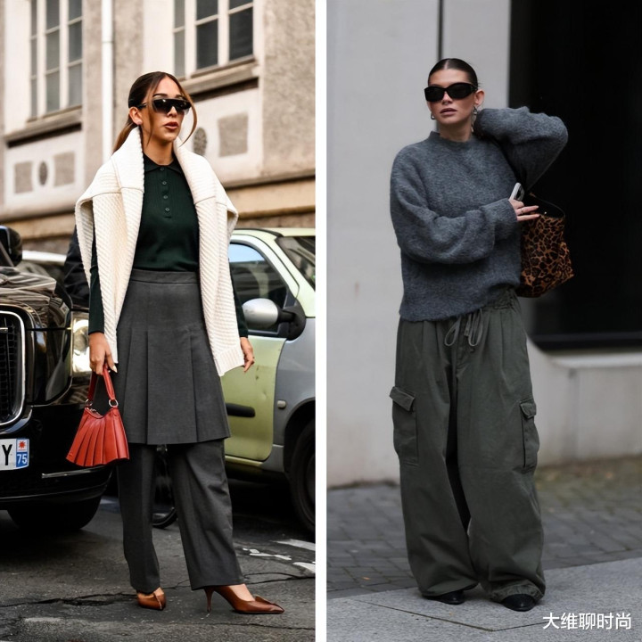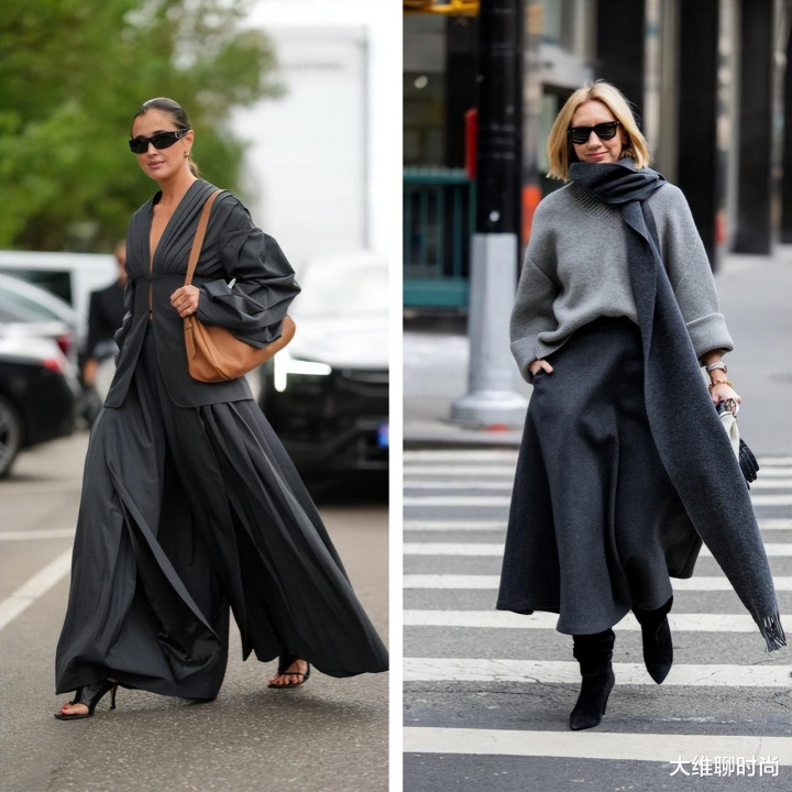 通过将裙装与裤装叠穿,为深色系穿搭增添层次感。白色针织披肩的搭配技巧同样值得借鉴,能瞬间改变整体氛围。