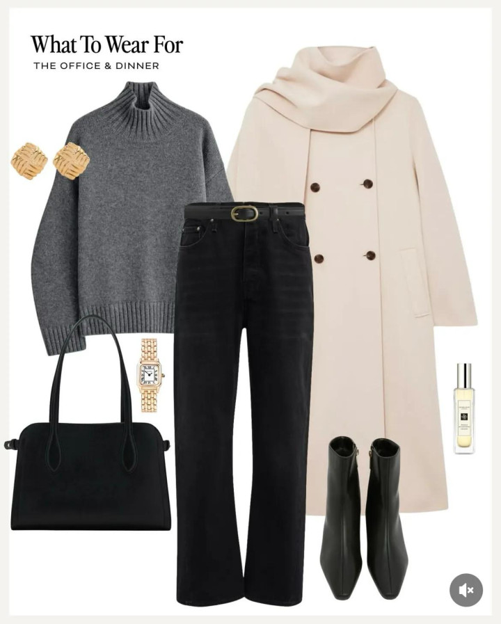 奶白色很适合直线版型的大衣,尤其羊绒面料会更显品质感。选带围巾款的长大衣,简单搭基本款的毛衣牛仔裤就很好看。