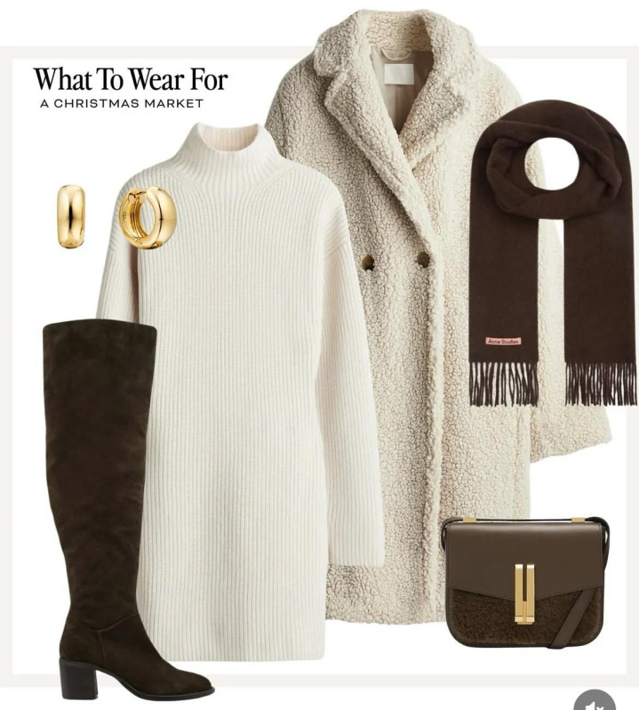 一件长款泰迪大衣,有着摇粒绒的软糯,直接用针织款连衣裙配长靴,用白色大衣穿出冬日美好吧。