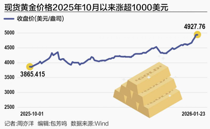 短短三个多月后,金价的“狂飙”之势让众多投资者始料未及。1月23日,现货黄金逼近5000美元/盎司关口,2026年已经飙升约15%。