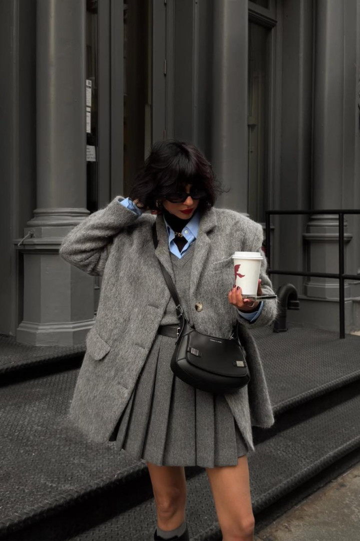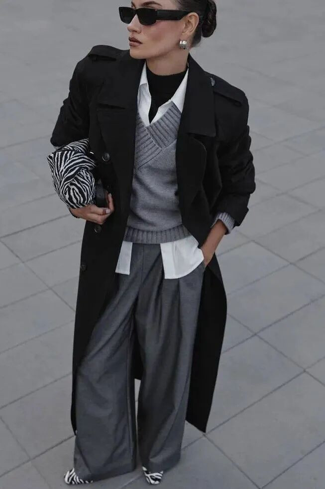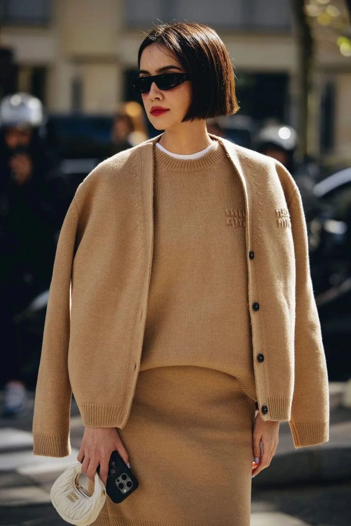 都市女子要是这样穿搭,内层是贴身的针织衫,中层衬衫的领角相当利落,外层粗针毛衣比较随性,正式与松弛在三层衣物里实现平衡。