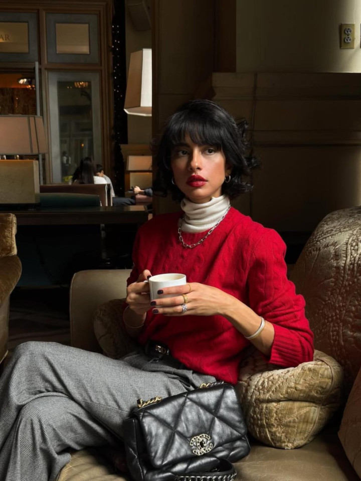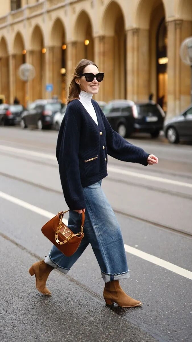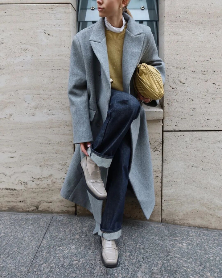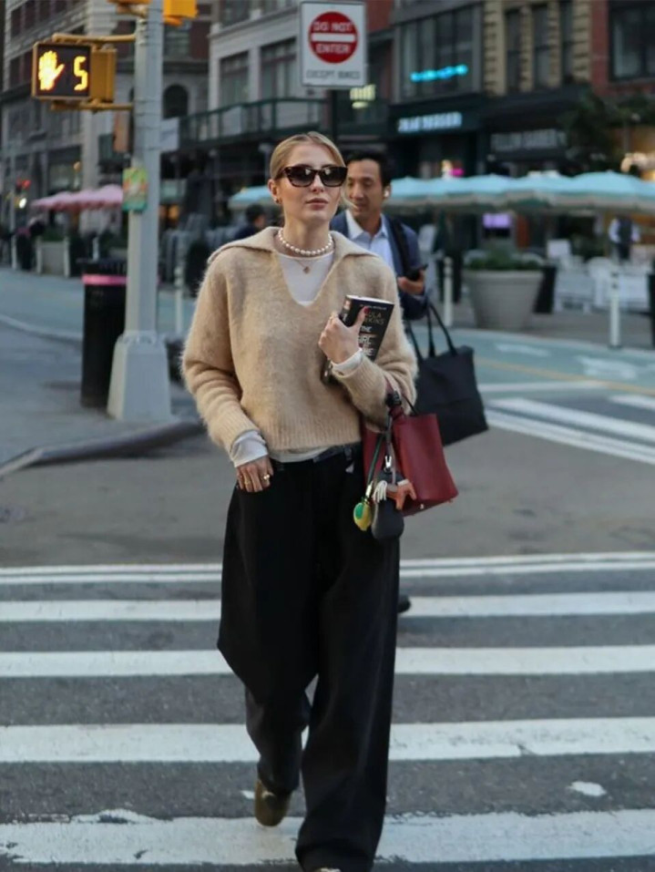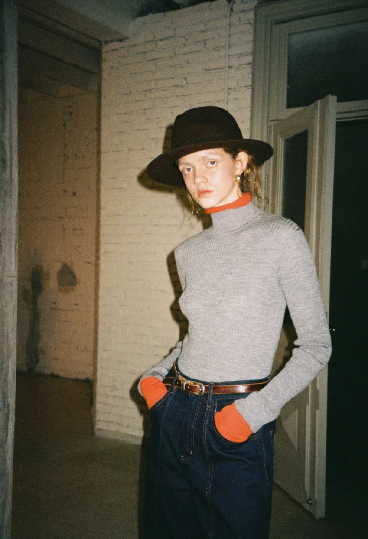 脖颈间穿着高领毛衣,仿佛给自己写了一封私密又舒适的情书,外面套一件圆领毛衣,松松垮垮的,透着几分不经意的时髦。