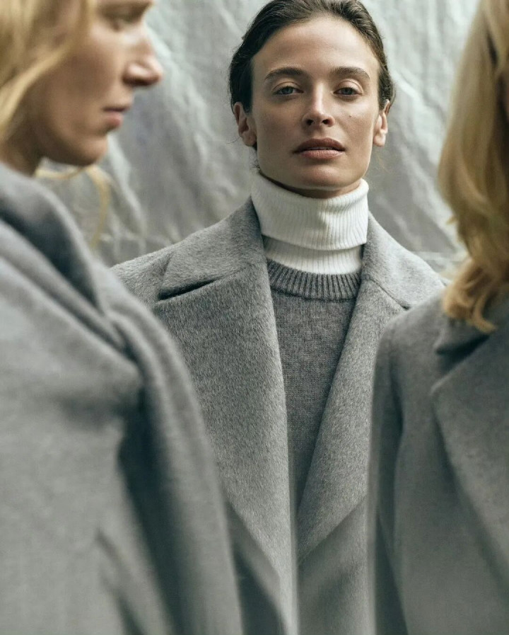 深幽的V领衫搭配雪白的高领衫,好像黑夜和飘雪相对;浅驼色的外衫叠着烟灰色的内搭,就像午后3的阳光斜照进咖啡杯。