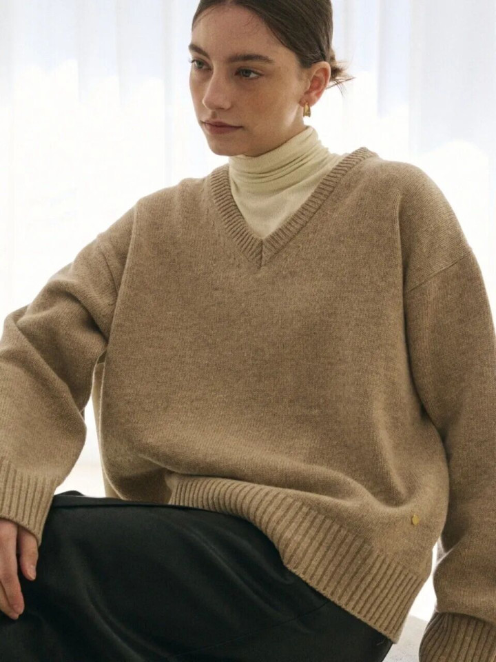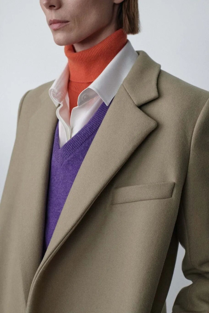 V领不宜太浅,也不宜太深,恰到好处的开口,才能让高领若隐若现,像一句欲言又止的情话。