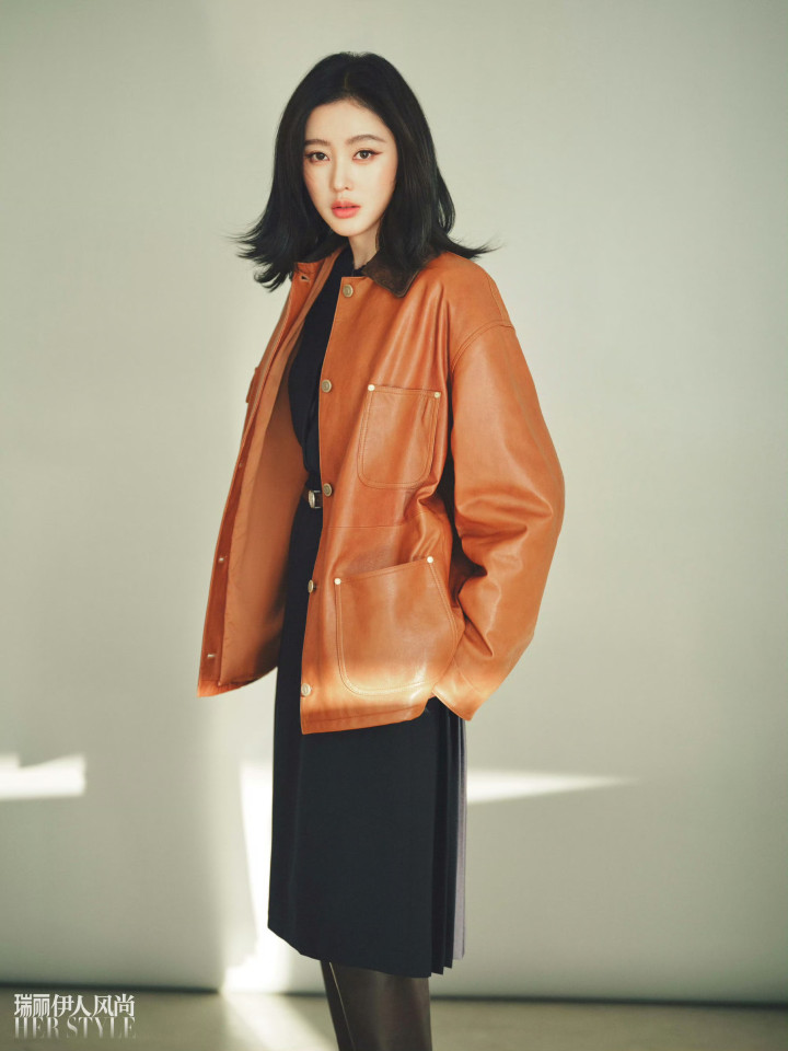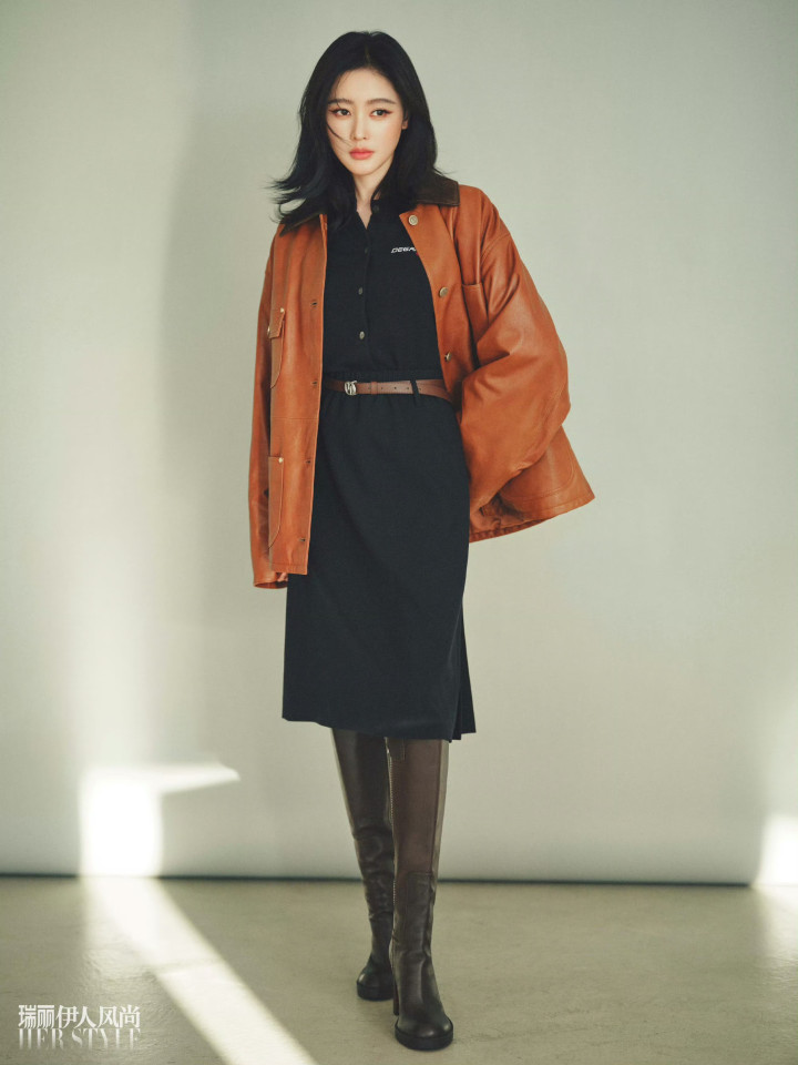 Oversize的焦糖色皮质夹克松垮地搭在肩头,黑色衬衫裙腰间系着细窄棕皮带,一松一紧间衬出腰肢的纤细线条,工装风的率性和裙装的柔美交织成别致韵味。