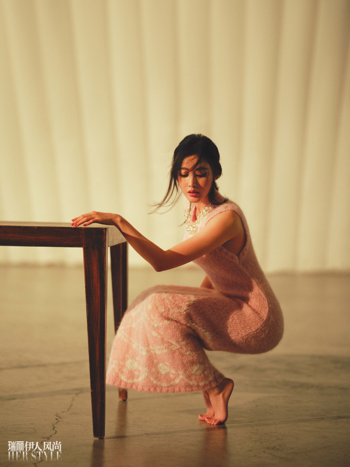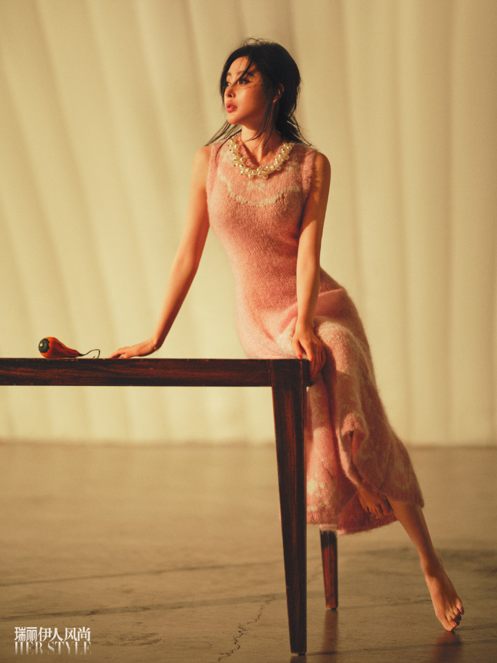 粉色针织无袖长裙裹着倚桌而立的身形,柔粉纱质在暖光里晕出朦胧的甜意,赤脚踩在地面的姿态舒展又娇柔,眉眼间的柔媚在暖调光影里愈发动人。
