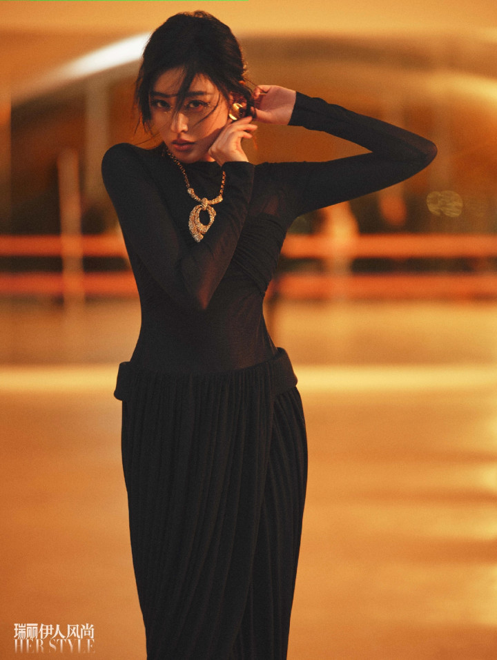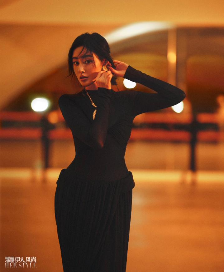 以黑色修身长裙立于画面中央,裙身褶皱顺着身形勾勒出流畅曲线,颈间金饰细闪如碎光,抬手理耳的动作带着不经意的优雅。