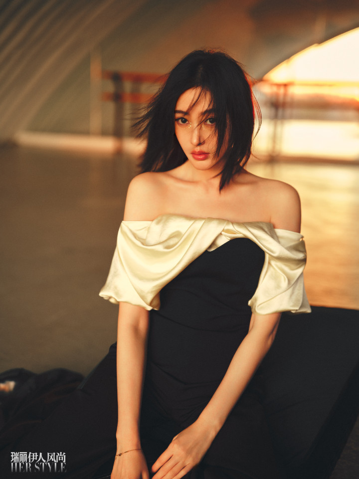 张天爱一袭黑白拼色露肩礼裙跪坐于暖光之中,缎面褶皱漾开鎏金波纹般的柔润光泽,肩颈线条在橙光晕里愈发利落分明。