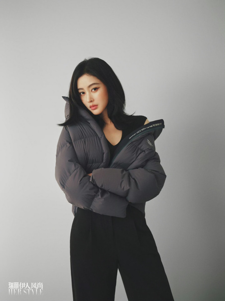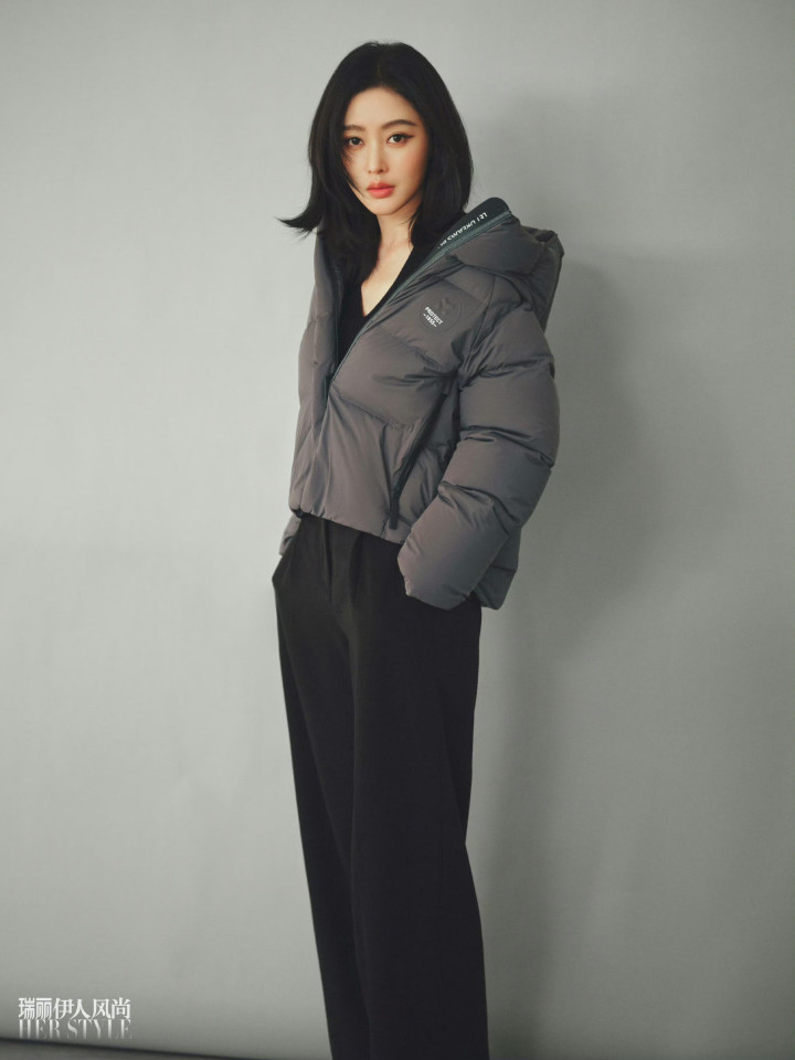 在极简冷调背景抱臂而立,深灰短款羽绒服配黑裤,裤装的利落线条中和了羽绒服的蓬松感,简约搭配更衬出她的气场张力。