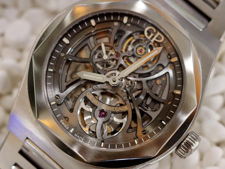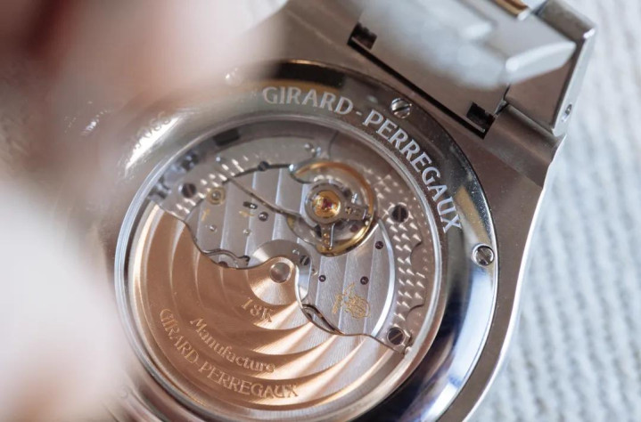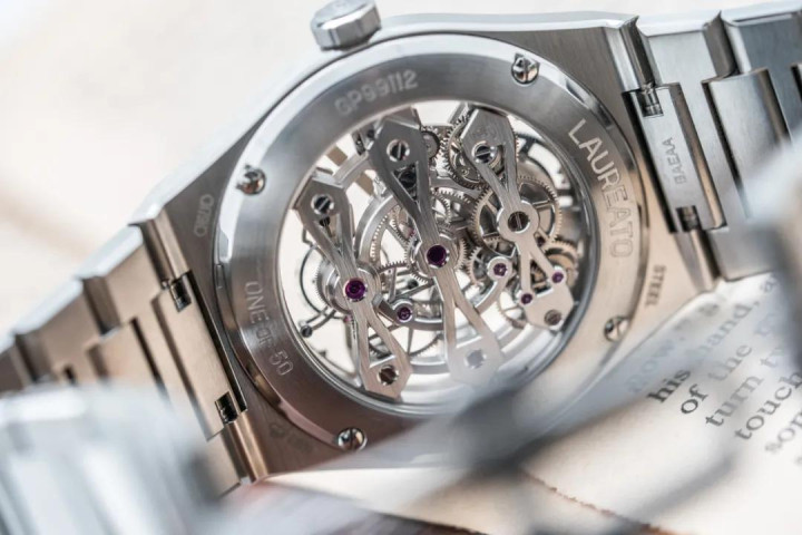 镂空得好不好,甚至无需多言,几个表款摆在一起,不比自明。这枚镂空桂冠搭载的Cal.GP01800-0006可以说是专为镂空设计的。它把擒纵机构居中设置在12点位,奠定了整个盘面在视觉上的“正”,给整个盘面的视觉均衡感打下基础,而且摆夹板的线条也很优美,同时又没有过多的遮挡擒纵机构能够展现的动感;擒纵机构的左下方,一个小秒针被直接安置在秒轮之上,给整个盘面进一步增加了另外一种动感。我非常喜欢这种小三针的设置方法,如果把小秒针防止在9点位,则盘面左侧的夹板线条就会变得拥挤,如果是大秒针,对于镂空盘面来说又有点抢戏。