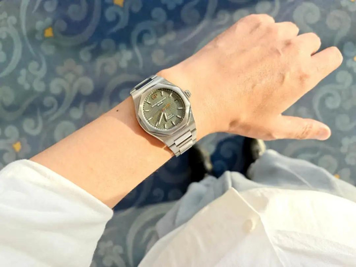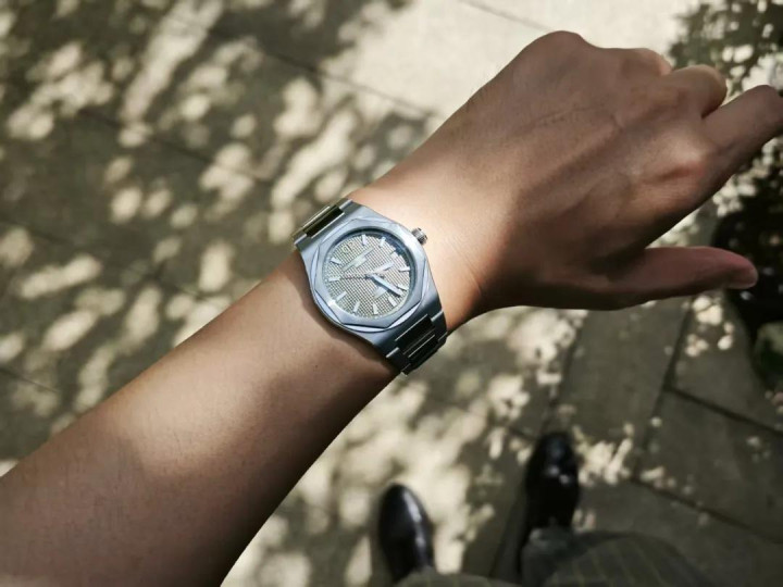 桂冠的流线型表耳相比鹦鹉螺的更宽大,流线型更加明显,不知是否因为这个原因,从38毫米到42毫米,在我上手我都觉得非常合适。佩戴38mm的体验款显得更加优雅,佩戴42毫米的镂空桂冠也没有不协调,反而更有运动范儿。如果一定要在两个尺寸里选择一个,我更倾向42毫米的尺寸。