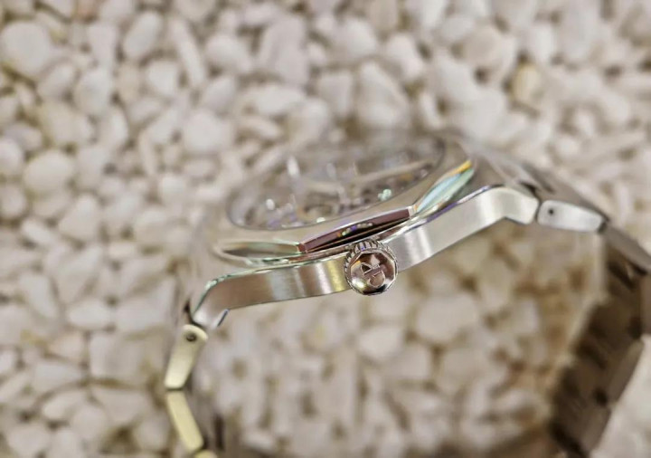 桂冠从诞生之初就保持了独立的设计风格,最典型的设计是双层表圈结构:上层为对称八边形,下层为圆形,然后再过渡到表壳,呈现了丰富的层次感和精致感。在我印象里,一体化壳链设计真正火起来,还是2018年之后才慢慢开始的。为什么这么说?我清楚的记得2017年我买皇家橡树的时候,销售给了我85折的折扣价格。溢价?根本没有的事!