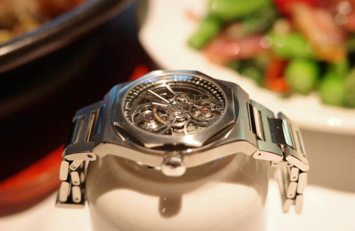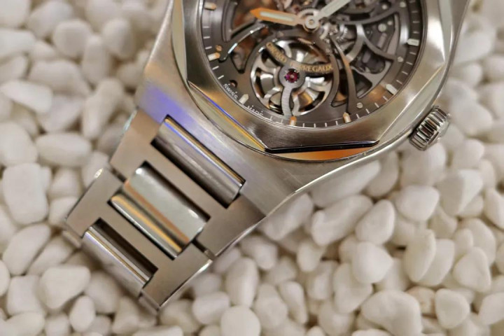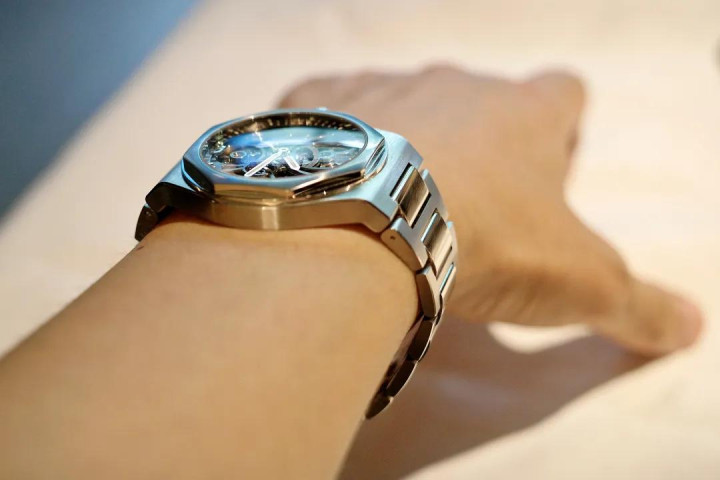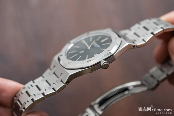在一体化设计的腕表里,尽管不是最贵的,但桂冠多层连接的结构可能是最复杂的。层次多了,对细节做工的要求也就更高了。八边形的上层表圈主要采用了拉丝工艺,但在边缘处又进行了倒角抛光,有点接近顶级机芯打磨的倒角工艺;下层圆形表圈则完全抛光;表壳和表链的主体也使用了拉丝工艺,边缘也进行倒角抛光,表节中粒也是抛光。这种交互的打磨工艺带来了光泽性上的灵动感。拉丝使得整表的亮度更高,抛光又让腕表在不同方向的光线下更闪。