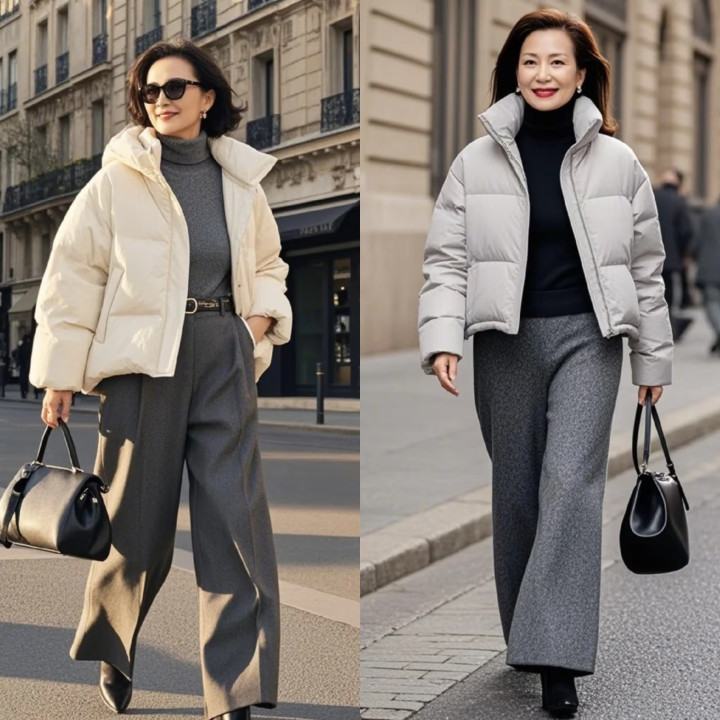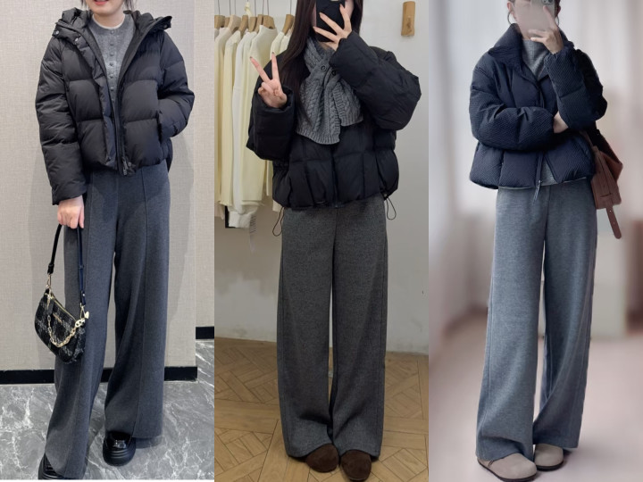 如果选择灰色阔腿裤搭配,效果则大不相同。不仅能解决颜色沉闷老气和身材缺陷问题,还能穿出显高显气质造型,满足冬季穿搭需求。