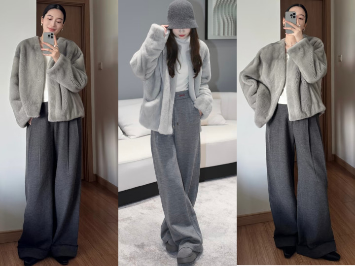 工作之余,遇到公司聚餐或朋友聚会,上衣可以选择灰色皮草外套,再搭配深灰色羊毛阔腿裤,用白色内搭提亮造型,穿出慵懒松弛不失贵气造型。