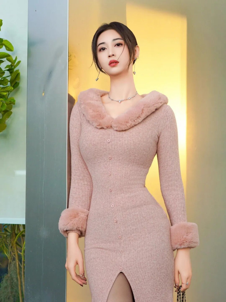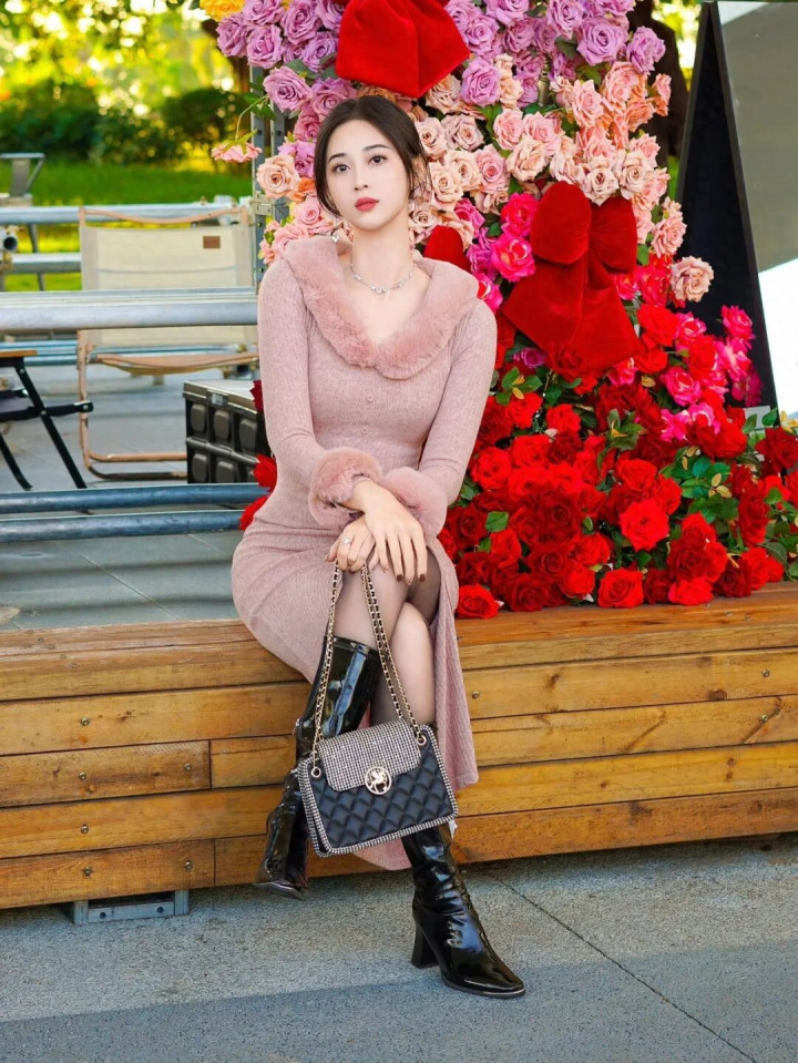 开云app官方 粉色针织裙搭配长靴, 优雅温柔, 太显气质了
