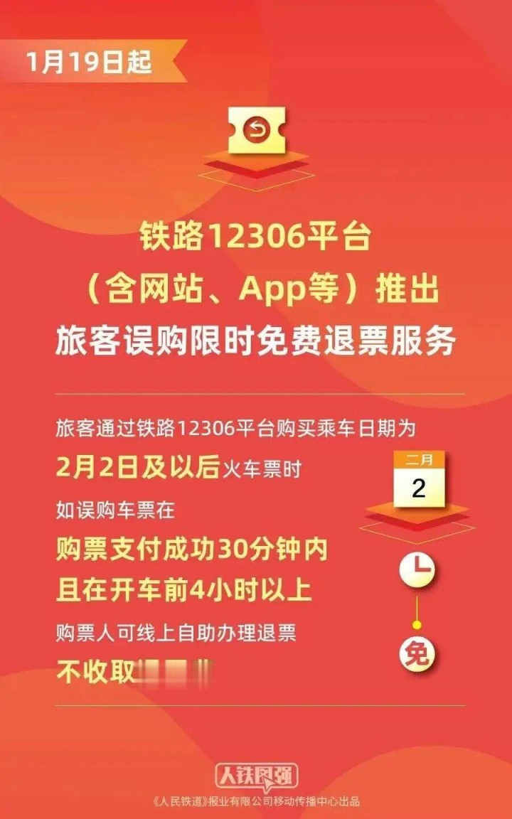 1月19日起,铁路12306平台(含网站、App等,下同)推出旅客误购限时免费退票服务,旅客通过铁路12306平台购买乘车日期为2月2日及以后火车票时,如误购车票在购票支付成功30分钟内且在开车前4小时以上,购票人可线上自助办理退票,不收取退票费。